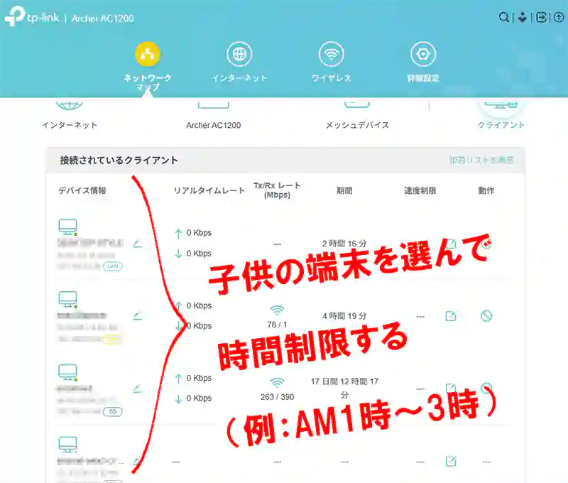 家庭のWiFiルーターの設定で、子供のスマホ端末に制限をかけるんです。
